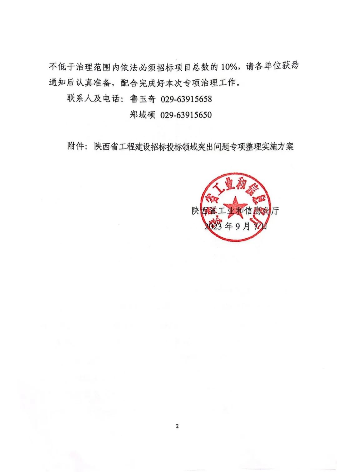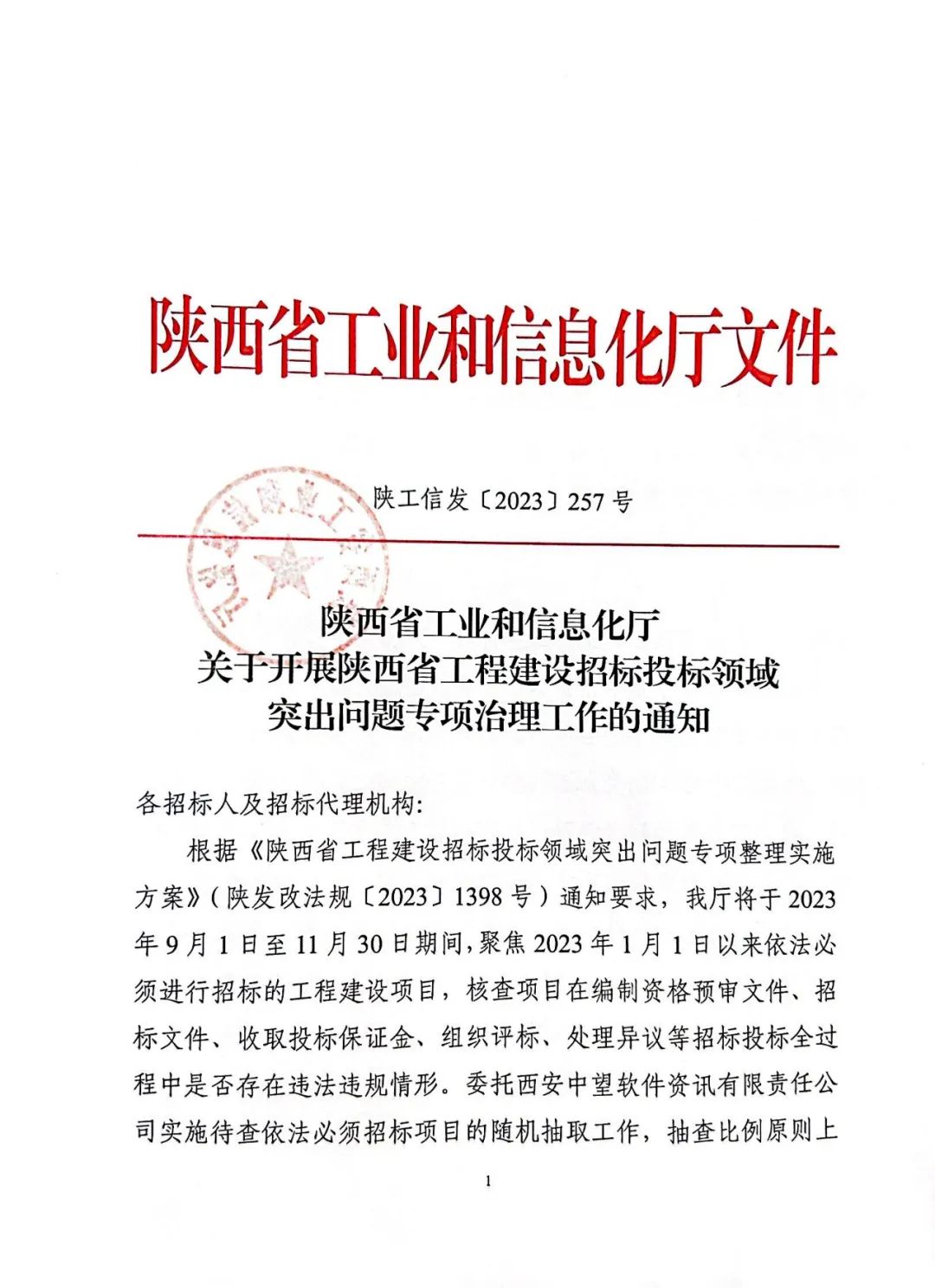 根据《陕西省工程建设招标投标领域突出问题专项整理实施方案》(陕发改法规〔2023〕1398号)通知要求,我厅将于2023年9月1日至11月30日期间,聚焦2023年1月1日以来依法必须进行招标的工程建设项目,核查项目在编制资格预审文件、招标文件、收取投标保证金、组织评标、处理异议等招标投标全过程中是否存在违法违规情形。委托西安中望软件资讯有限责任公司实施待查依法必须招标项目的随机抽取工作,抽查比例原则上不低于治理范围内依法必须招标项目总数的10%,请各单位获悉通知后认真准备,配合完成好本次专项治理工作。联系人及电话:鲁玉奇 029-63915658 郑域硕 029-63915650
