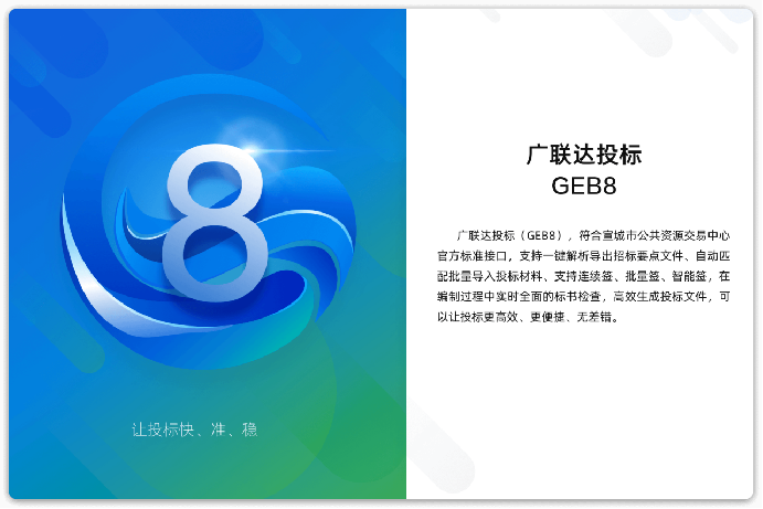 广联达投标(GEB8),符合宣城市公共资源交易中心官方标准接口,支持一键解析导出招标要点文件、自动匹配批量导入投标材料、支持连续签、批量签、智能签,在编制过程中实时全面的标书检查,高效生成投标文件,可以让投标更高效、更便捷、无差错。