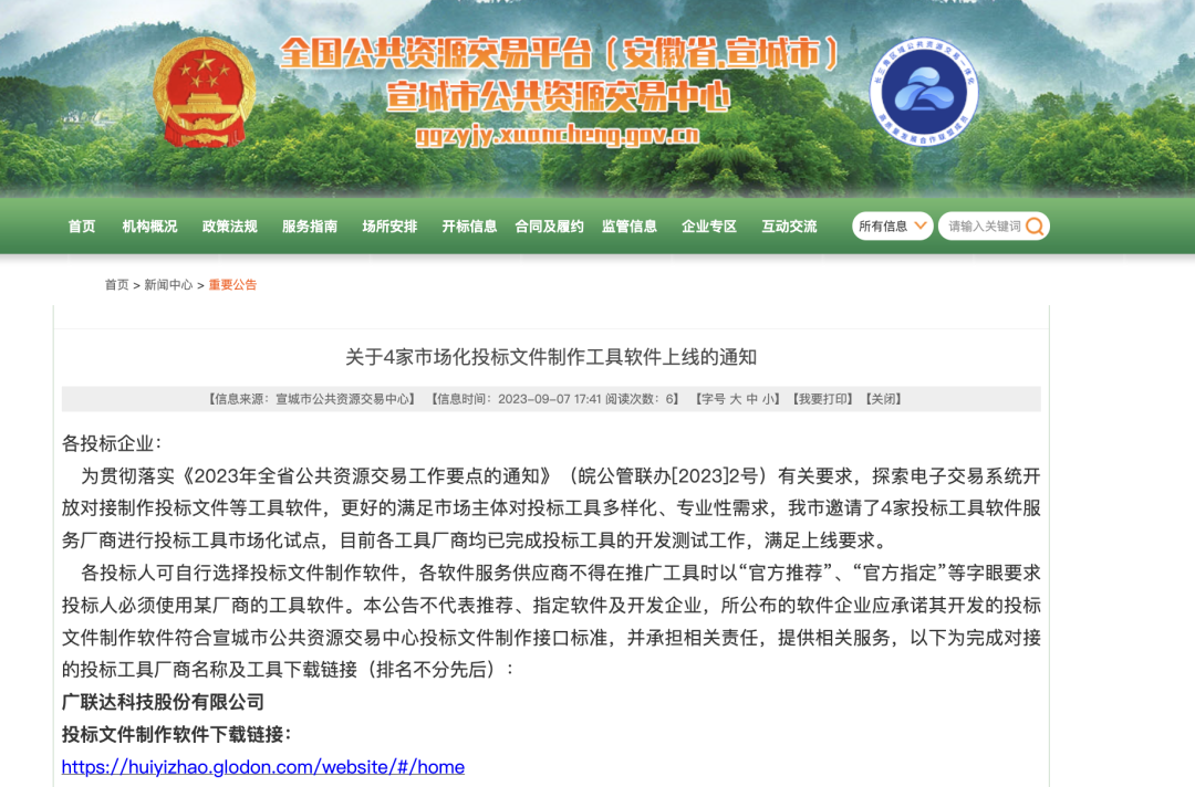 为贯彻落实《2023年全省公共资源交易工作要点的通知》(皖公管联办[2023]2号)有关要求,探索电子交易系统开放对接制作投标文件等工具软件,更好的满足市场主体对投标工具多样化、专业性需求,广联达公司参与宣城市公共资源交易中心关于投标工具软件服务厂商进行投标工具市场化试点的联测,目前已完成投标工具的开发测试工作,符合宣城市公共资源交易中心投标文件制作接口标准,满足上线要求。