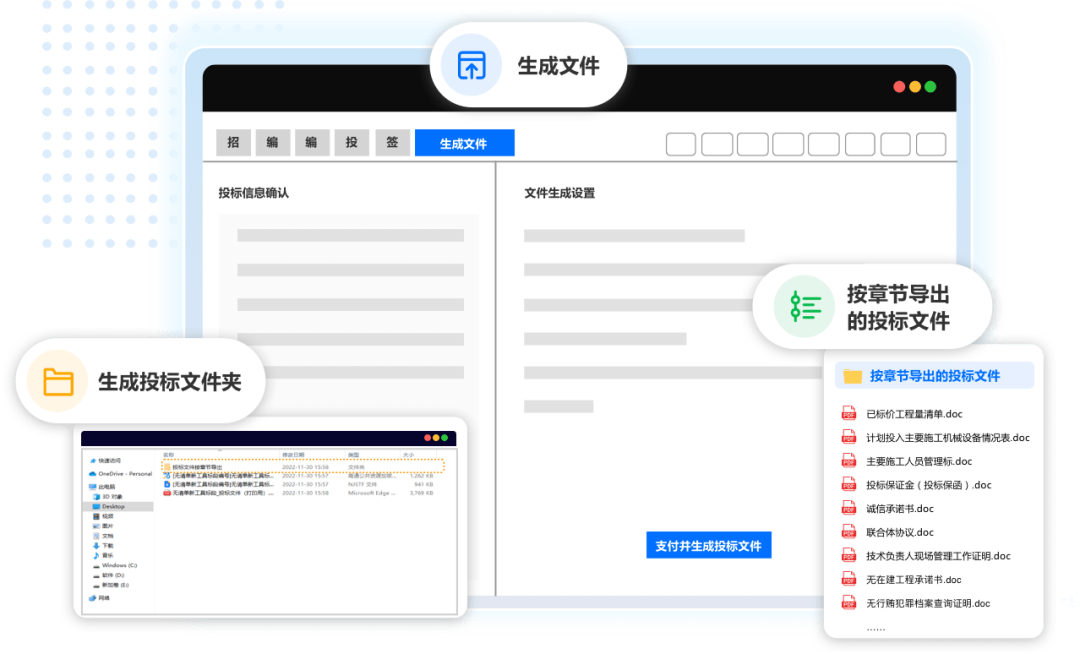 按照平台接口规范生成投标文件,一次生成加密文件、未加密文件、整份投标文件PDF、各章节PDF文件;