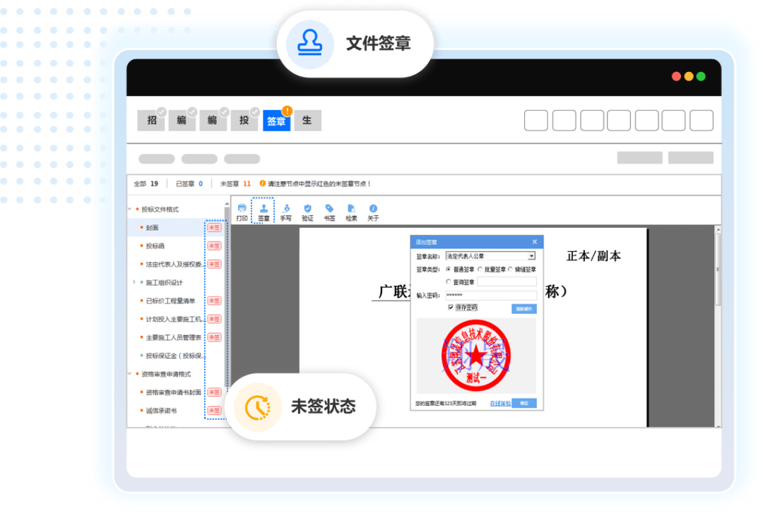 招标设置的必签章节红色提醒,也可根据需要对其他章节进行签章;