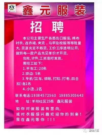 【县内岗位】鑫元服装招聘