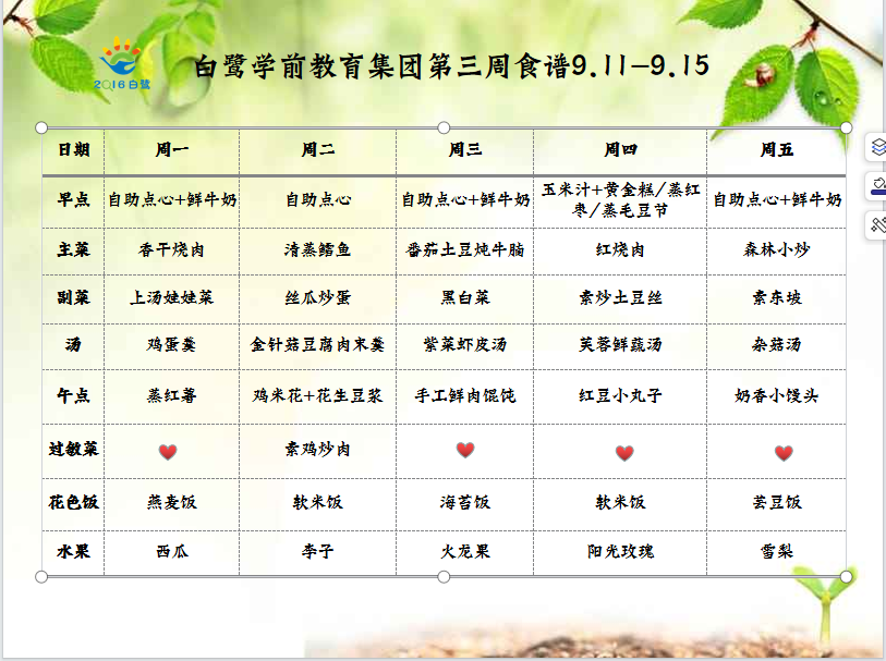 【白鹭·保健】美好“食”光|白鹭学前教育集团第三周食谱9.11-9.15
