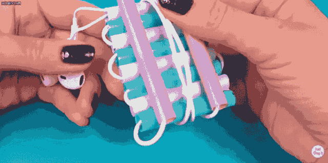 将他们依次排列到一起,然后用弹力绳穿起来,穿插的方式可以不同颜色的弹力绳交叉进行。