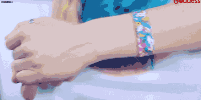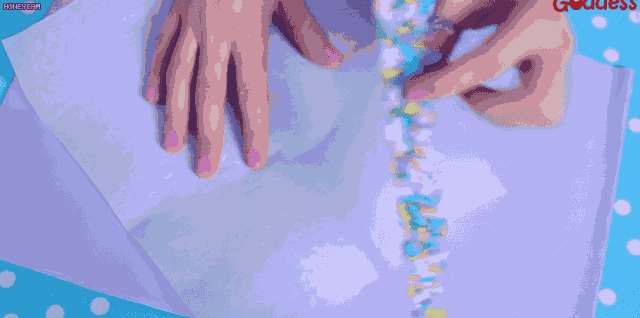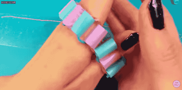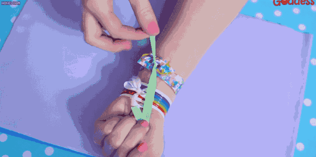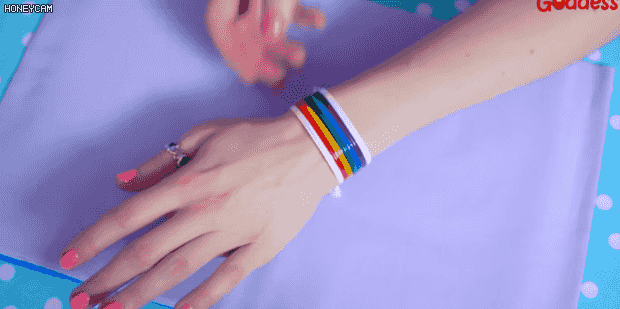然后你可以将它裁剪出你喜欢的长度,在上面打个洞用丝绳捆在一起,就是漂亮的彩虹手链,别人想买都买不到~