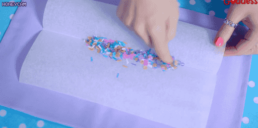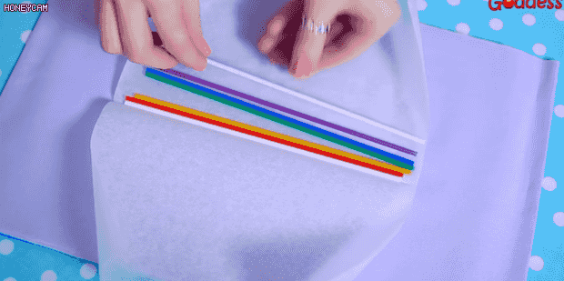 把不同颜色的吸管按照喜欢的样子排列,然后用油纸包起来,用熨斗熨平,打开,就是漂亮的彩虹状了!