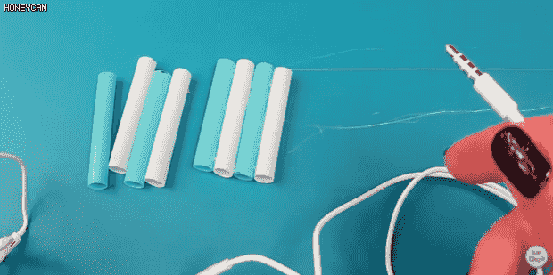 然后用胶水把它们黏在一起,排成排,然后将耳机穿进去,调整成合适的长度。一个美丽的缠线器就初现雏形了!
