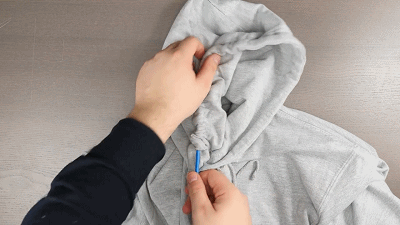 一些带抽绳的连帽衫,抽绳抽出后怎么装回去令人头疼。取一根吸管,将抽绳穿在吸管里,固定住,可以用订书机订起来。最后用吸管带着抽绳去穿,很容易就搞定了。