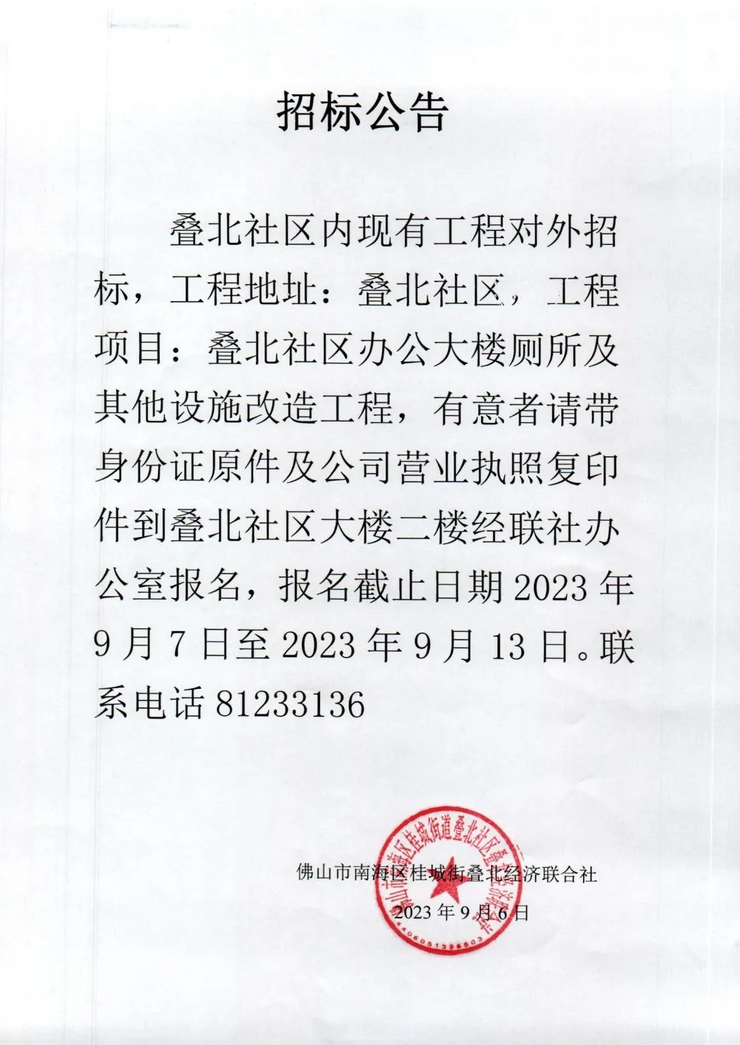 【招标公告】叠北社区办公大楼厕所及其他设施改造工程