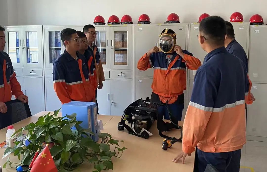 本次培训内容分为使用前调试、正确佩戴方法、呼吸器报警性能检查、空气呼吸器脱卸、气瓶更换、日常维护保养六大模块,由班组长和安全员理论讲解、现场示范,一对一辅导空气呼吸器正确佩戴和使用方法。同时,为检验学习效果,参与培训的员工需要对呼吸器的应用功能进行实操演练,通过问题预演与实地模拟,考核受训者理论转化水平,定向强化检维修人员有限时间内正确决策及科学处置能力,充分调动学员主观能动性学以致用,熟练掌握救生器材的使用方法。