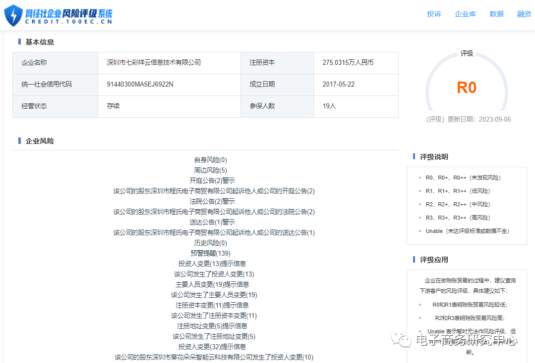 据“网经社企业风险评级系统(CREDIT.100EC.CN)”显示,深圳市七彩祥云信息技术有限公司的风险评级为R0,公司目前所未发现风险。