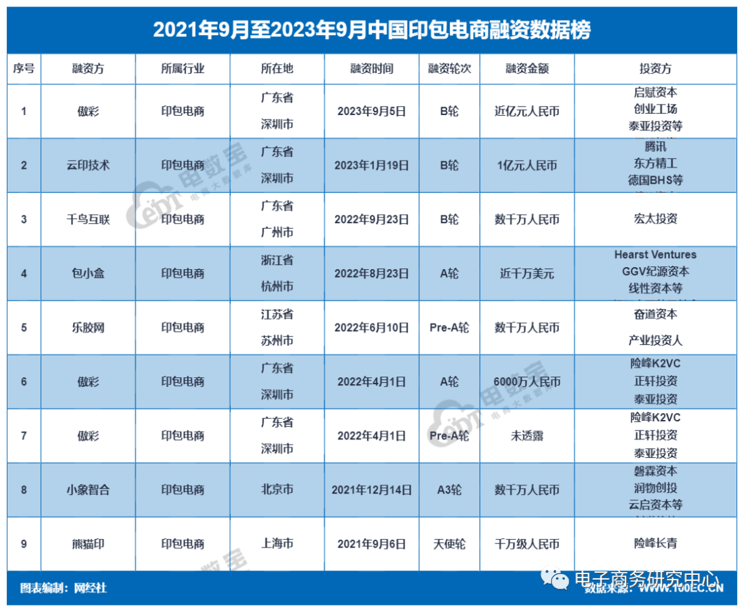 据“电数宝”电商大数据库(DATA.100EC.CN)显示,2021年9月至2023年9月,国内产业电商印包电商领域共发生了9起投融资事件,融资总额约3.9亿元,涉及的公司包括:傲彩、云印技术、千鸟互联、包小盒、乐胶网、小象智合、熊猫印等。