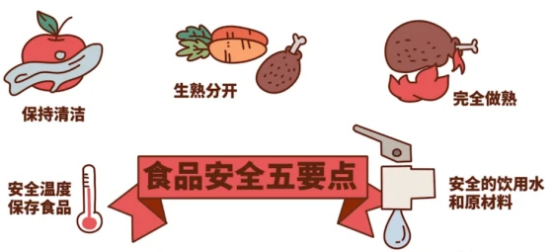 4.在安全的温度下保存食物:食物冷却后再放冰箱存放,生肉类不要反复冻融,定期清理冰箱,不买、不吃超过保质期的食品。