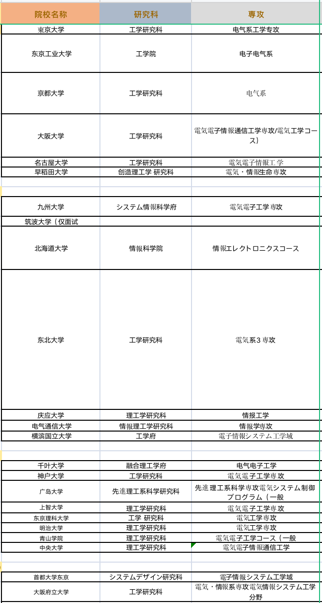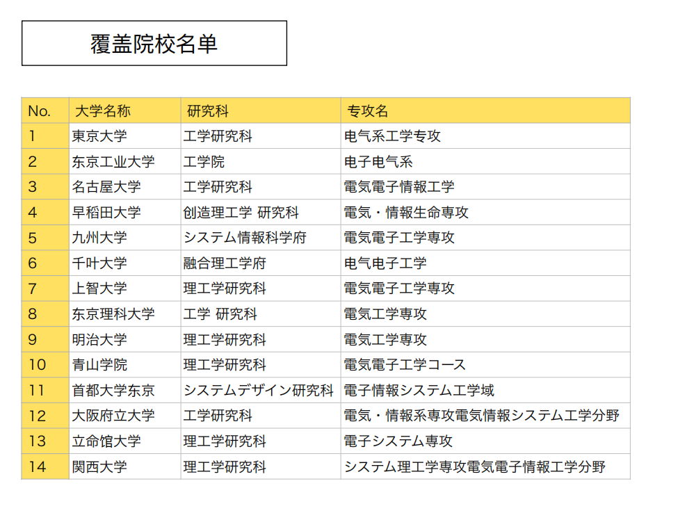 以考试科目为依据,东学理工综合了各大院校考试特色,从中选出了14所对备考电子电气专业的学生来说性价比最高的院校。另外,电子电气专业考试科目众多,很多同学也不太了解应该要去准备哪些科目,关于这一点我们总结为:电磁气学、电子回路、电气回路,这三门课备好,之前提到的14所院校则都可以报考,上至东大工学电气,下至关西大学理工学研究科システム理工学専攻電気電子情報工学分野。