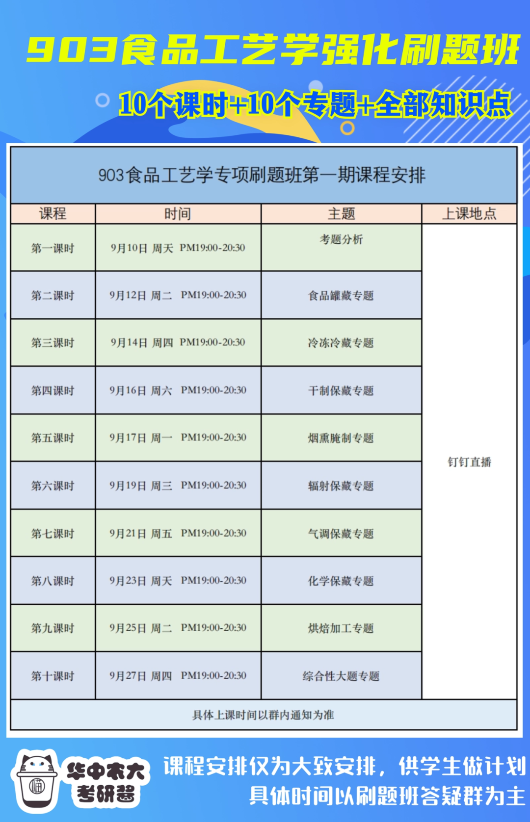 课程采用直播授课+录播无限播形式,每次课程约60-90分钟,分专题讲解903食品工艺学习题;