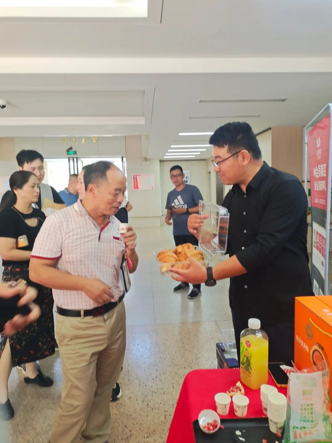 在教师节即将来临之际,7号下午三点M会员商店应学校工会之约,在学校教学楼一楼大厅举行″教师节专享美食品鉴活动″。M会员商店将本企业的特色产品如:夏日清凉小青柠汁、烘焙甜点、进口水果等各种美食呈现到老师们面前,供老师们品鉴!李文斌店长也专程来到学校,真诚的预祝老师们:教师节快乐!对老师们用心用情为特殊教育的付出表达了崇高的敬意!并希望越来越多的企业和社会力量关心和支持特殊教育事业的发展,投身教育帮扶公益事业中来。学校副校长、党支部副书记、纪检书记、工会主席倪忠鹏老师代表学校向M会员商店学校带来的社会关爱表示感谢,让学校的老师们深深感受到了社会的温暖、企业家的教育情怀,在新的学年里学校将再接再厉,努力谱写特校新篇章。学校大厅弥漫着感恩的温情、幸福的味道,此次活动就在这样和谐的氛围中结束了。