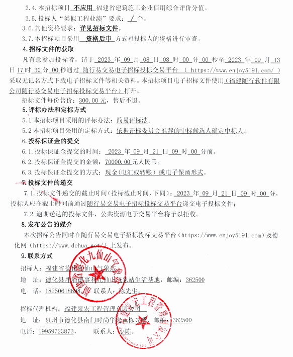 本次招标公告同时在随行易交易电子招标投标交易平台(https://www.enjoy5191.com)及德化网(https://www.dehua.net/)上发布。