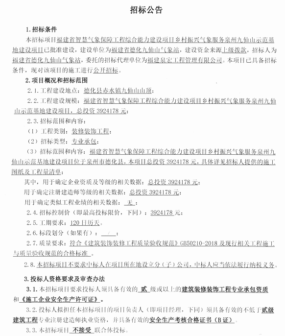(3)招标范围和内容:福建省智慧气象保障工程综合能力建设项目乡村振兴气象服务泉州九仙山示范基地建设项目位于泉州市德化县,本项目总投资3924178元,具体详见招标人提供的施工图纸及工程量清单;