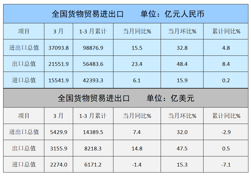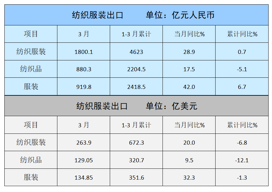 3月,纺织服装出口1800.1亿元,增长28.9%,其中纺织品出口880.3亿元,增长17.5%,服装出口919.8亿元,增长42%。