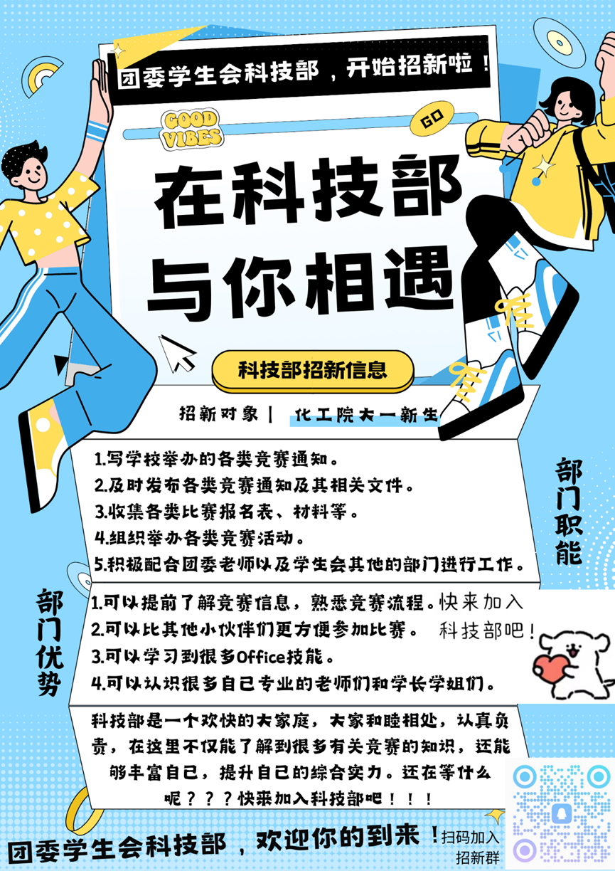 在科技部,你可以提前了解竞赛信息,熟悉竞赛流程,方便参加比赛;可以学习到Office办公技能,提升自己的综合能力;可以锻炼自己,克服社恐,结交到不同专业的朋友,交流学习方法,获取经验,提升自己。好处多多,优势多多,机不可失,失不再来,科技部就等你来!