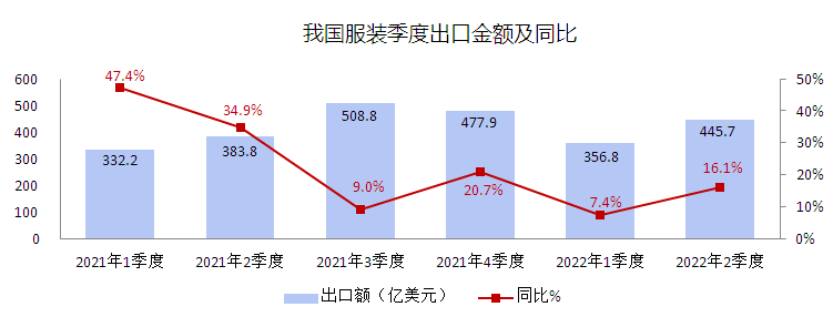 据海关统计,上半年我国服装累计出口802.6亿美元,同比增长12.1%,创历史同期新高。从季度出口情况来看,一季度开局平稳,在去年高基数的基础上增长7.4%。4月当月,部分主要出口省市受疫情影响较大,5月和6月,出口迅速回稳反弹,二季度服装出口同比增幅达16.1%,比一季度高8.7个百分点。