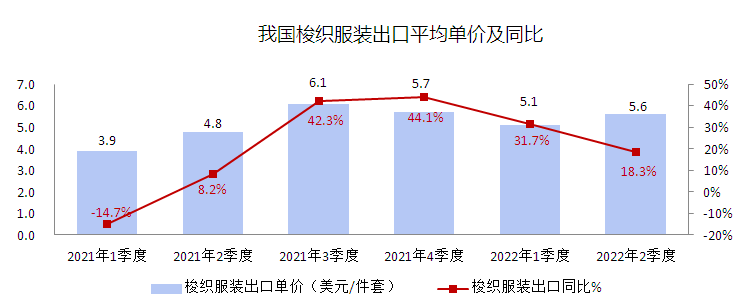 受原材料价格上涨、出口品类变化等因素影响,自去年三季度以来,服装出口价格总体涨幅明显。梭织服装出口平均单价自去年三季度开始猛涨40%以上,今年有所回落,一、二季度同比涨幅分别为31.7%和18.3%。针织服装出口平均单价增长相对稳定,今年一、二季度同比涨幅分别为8.7%和11.7%。