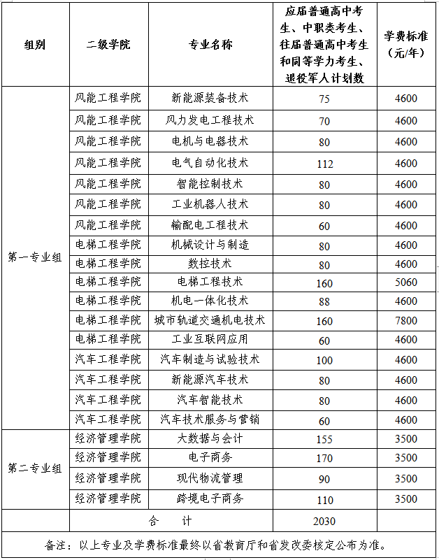 (表一 单招专业组、专业、计划和学费标准一览表)
