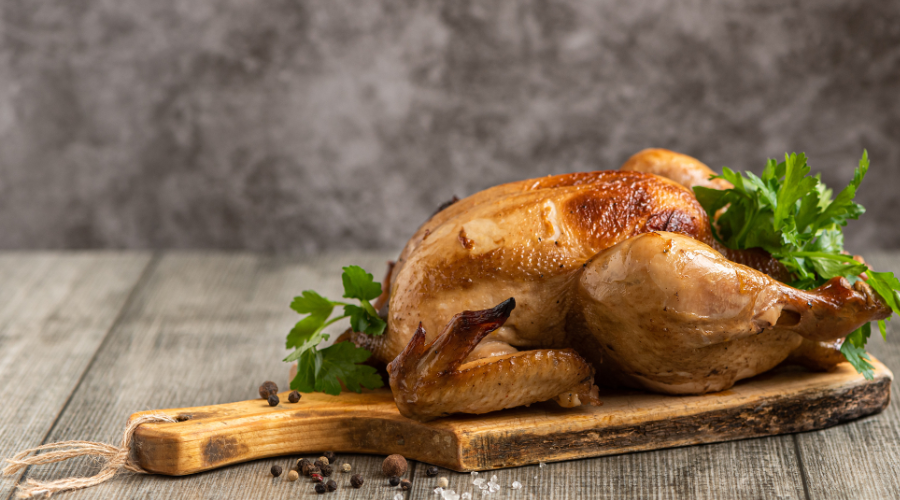 鸡喉部开一个小口将一侧翅尖插入喉部开口处,从鸡嘴抽出另一侧翅膀扭转,窝向背部盘好的鸡状如琵琶。