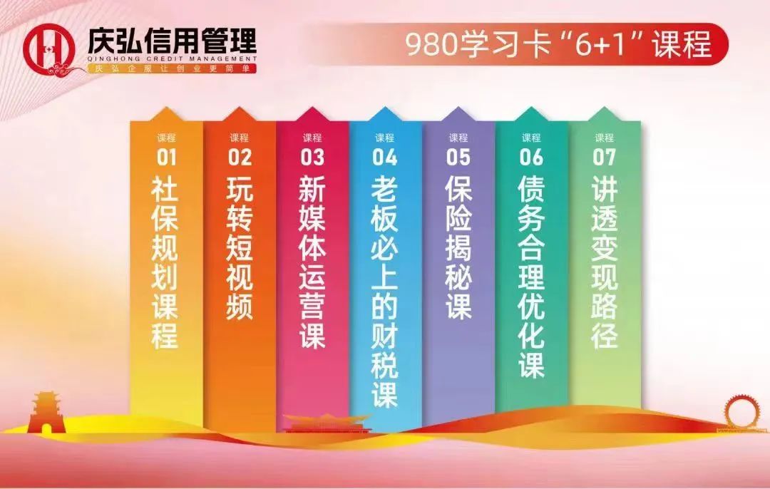 “980学习卡”课程“6+1”,具体包含社保规划课、玩转短视频、新媒体运营课、老板必上的财税课、保险揭秘课、债务合理优化课、讲透变现路径。
