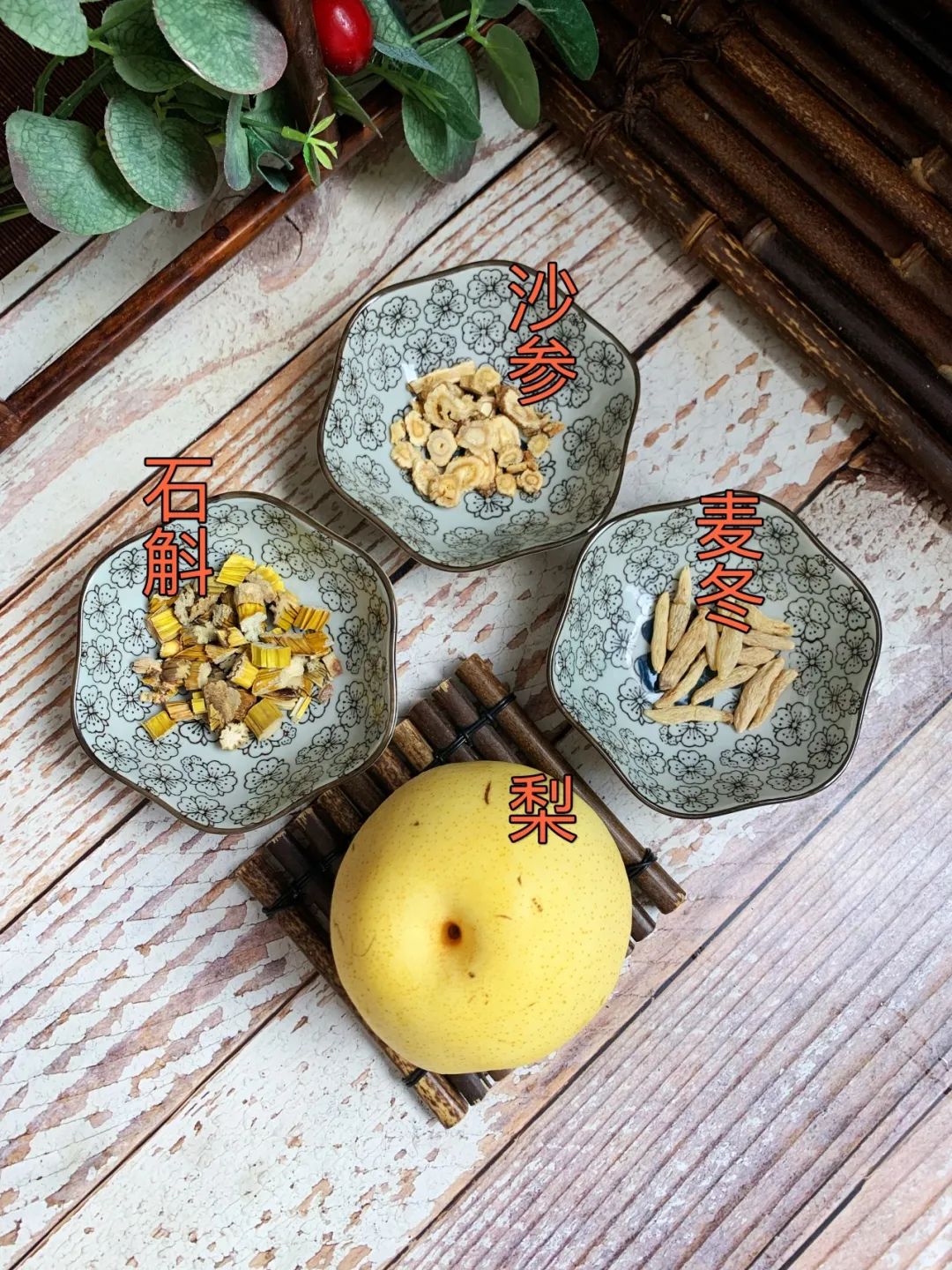 以石斛甘能滋养,微寒清泄,清滋为用;以麦冬质润甘补,既养阴生津,又润肺清心;以北沙参擅养阴清肺,益胃生津,凉补为用;再配合时令梨子,清热化痰止咳,共谱一曲清凉滋润。