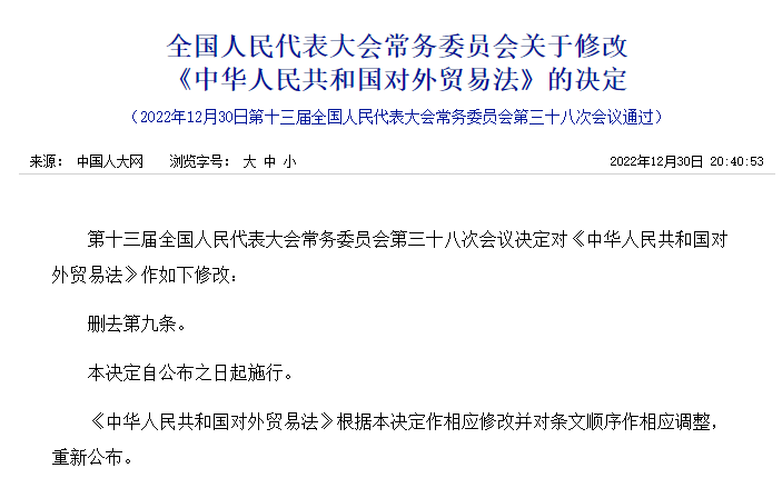 据商务部3日消息,2022年12月30日,十三届全国人大常委会第三十八次会议经表决,通过了关于修改对外贸易法的决定,删去《中华人民共和国对外贸易法》第九条关于对外贸易经营者备案登记的规定。*第九条:从事货物进出口或者技术进出口的对外贸易经营者,应当向国务院对外贸易主管部门或者其委托的机构办理备案登记;但是,法律、行政法规和国务院对外贸易主管部门规定不需要备案登记的除外。备案登记的具体办法由国务院对外贸易主管部门规定。对外贸易经营者未按照规定办理备案登记的,海关不予办理进出口货物的报关验放手续。http://www.npc.gov.cn/npc/c30834/202212/1fb87c771e914c30918cf750b69cbaa6.shtml根据决定,自2022年12月30日起,各地商务主管部门停止办理对外贸易经营者备案登记。对于申请进出口环节许可证、技术进出口合同登记证书、配额、国营贸易资格等相关证件和资格的市场主体,有关部门不再要求其提供对外贸易经营者备案登记材料。从事进出口业务的企业(贸易公司),无需再前往商务部办理对外贸易经营者备案登记手续(注:以自己抬头发货或自主报关的仍需办理海关收发货人备案,出口企业如需退税,仍需办理退税资格备案)。商务部表示,这是外贸经营管理领域重大改革举措,是中国政府坚定推进贸易自由化便利化的重要制度创新,将有利于进一步优化营商环境,释放外贸增长潜力,推进贸易高质量发展和高水平对外开放。中国世界贸易组织研究会副会长霍建国表示,我国对外贸易经营权的变化与放开显示了一种进步。这将更有利于企业进一步开展贸易经营,促进外贸发展,同时也是和国际接轨的一种制度型开放。在上海从事各项公司资质办理业务的会计师秋爽表示,如果企业需要从事进出口业务,办理对外贸易经营者备案是必需的流程之一。秋爽介绍,此前,若想进行进出口备案,需要经过最多6个环节,分别是:对外贸易经营者备案登记、海关企业注册、电子口岸卡申请、备案登记外汇账户、税务-出口退税备案以及开通公司银行外币账户。其中,对外贸易经营者备案登记需要先在商务部相关网站注册申请,线上填写材料,携带相关材料至线下审核后,领取备案登记。有了这一备案登记表的纸质版原件,才能办理下一环节的海关注册。秋爽说,取消备案登记后,对于新企业的办证人员来说,流程得到优化,减少了线下奔波的时间,提高了办事效率。“原本(整个进出口备案登记流程)最快可能需要7天的时间,(取消备案登记后)起码节约了一天。”她说。“网上注册登记填写材料的时间相对较快,线下则比较耽误时间。”秋爽说,“现在,后续流程中只需要线下前往海关一次即可。”“最早,我国外贸主体以国有企业为主,后来发展为集体所有制、上市公司和乡镇企业等。入世后,中国承诺放宽对外贸易经营权,社会上的一些个体经营者和民营企业也可以办理外贸经营权。这是从审批制到备案登记制的转变。”霍建国介绍,在备案登记制执行二十多年后,随着形势的变化,我国有条件进一步放开对外贸易经营权的管理。据海关总署统计,2022年前11个月,民营企业进出口19.41万亿元,增长13.6%,占我外贸总值的50.6%,比去年同期提升2.2个百分点。“当前民营企业占据我国外贸经营的大半,放开经营权会进一步激活民营企业参与外贸发展。从市场化的角度来说,这也会进一步增强透明性和公开竞争,因此,放开是必要的,至少是发展的方向。”霍建国说。但对外贸易经营者备案登记取消后,企业仍需办理海关登记获取报关权限。霍建国也补充道,放开后,仍需有配套制度的协同。“从进出口合规监管的角度来说,海关需要进行留底和备案,企业才能办理进出口的相关手续,这也是从业务的角度留了一个接口。”他称。2022年12月30日起取消对外贸易经营者备案登记手续,根据企业经营范围自动获取进出口权,但仍需办理以下事项:2019年10月,全国人大常委会通过了关于授权国务院在自由贸易试验区暂时调整适用有关法律规定的决定,其中,授权国务院在自由贸易试验区暂时调整适用对外贸易法第九条的规定,取消对外贸易经营者备案登记,调整在三年内试行。