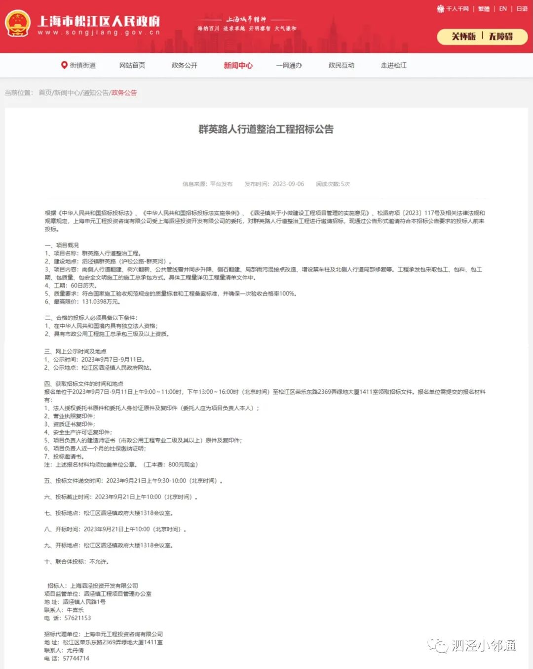 2、公示地点:松江区泗泾镇人民政府网站