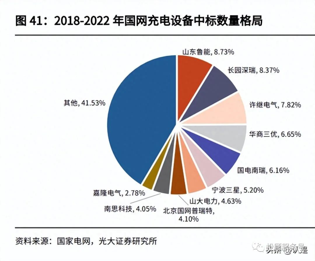 充电桩设备生产商数量众多,行业集中度较低。国家电网作为第一家进入充电桩 行业的建设方和运营商,也是国内最大的充电桩公开招标企业,其招标需求和中 标企业对行业具有较强的参考意义。2018-2022 年国网充电桩中标的企业共有 48 家,其中中标数量超过 1000 套的企业有 9 家,前十的中标数量占据整个市 场的 58.47%。2022 年当年中标数量前三的是国电南瑞科技股份有限公司、宁 波三星智能电气有限公司和杭州泰源电气有限公司,市占率分别为 9.38%、 8.12%、7.94%。