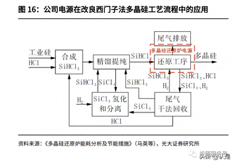 公司深耕光伏行业配套电源环节多年,主要聚焦于硅料和硅片环节。公司于 2005 年进入光伏电源行业,经过十多年发展成功破局国外产品垄断,实现国产化替代。 其中公司电源产品主要参与:(1)金属硅生产高纯多晶硅环节;(2)单晶硅片生产环节中长晶设备的 单晶炉电源。