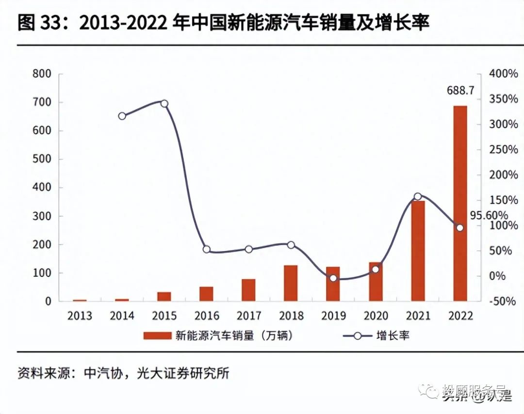 国内市场: 我国新能源汽车快速发展,2022 年新增销量渗透率达 25%+。据中汽协统计, 2022 年我国汽车产销量分别完成 2702.1 万辆和 2686.4 万辆,同比增长 3.4% 和 2.3%;新能源汽车产销量分别为 705.8 万辆和 688.7 万辆,同比增长 96.9% 和 95.6%;纯电动汽车产销量分别为 546.7 万辆和 536.5 万辆,同比增长 83.4% 和 81.6%。综合以上数据,2022 年全年汽车销量中,新能源汽车渗透率达 25.64%。 此前 2020 年 11 月发布的《新能源汽车产业发展规划(2021-2035 年)》提出 目标,到 2025 年新能源汽车销量占比达汽车销量的 20%,而该目标已在 2022 年提前且超额完成。我们认为,在碳达峰、碳中和背景下,全球电动化趋势已势 不可挡。在政策和市场的双重推动下,2022 年新能源汽车销量快速增长,展现 出有力的发展态势。