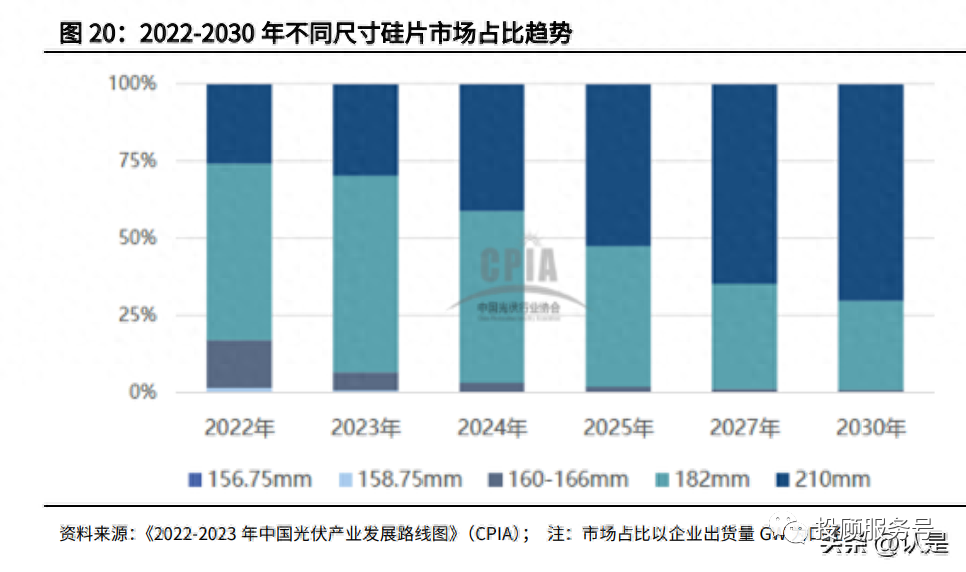 大尺寸硅片已成为市场主流。大尺寸硅片有着明显降本增效作用,符合光伏行业 降低度电成本的需求。根据 CPIA,我国 182/210mm 尺寸硅片合计市场占比(以 企业出货量 GW 为口径,下同)由 2021 年的 45%增加到 2022 年的 82.8%,并 且预计 210mm 尺寸硅片的市场占比将进一步提升,硅片环节长期发展方向确 定。