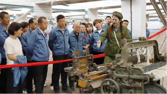 “您脚下的这条路,是由棉纺厂的老师傅们趴在地上将玛纳斯河岸的鹅卵石一颗颗打磨平整后铺成的......”在现场工作人员的引领下,全体党员干部迈着整齐划一的步伐进入了新疆戈壁印象的八一棉纺厂旧址。锯齿状屋顶的生产车间,保证了车间充足的采光和温湿度;沉淀的机油和保存完好的一代二代三代织布机如“无言战士”般向我们诉说了八一棉纺厂的发展史;近距离触摸着曾经在无数兵团儿女手中穿梭的织布梭子,全体党员干部穿越时空般参观充满历史感的八棉厂区,沉浸式的完成了1958工业之旅,深切感悟了兵团人艰苦创业的精神,唱响了此次红色教育之旅的主旋律!