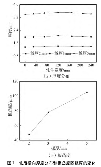 为了分析板厚对板凸度的影响规律,对宽度均为240mm,厚度为2mm、3mm和5 mm,且厚度分布均匀的H24纯铝板,在设定压下率为30%的情况下进行了轧制实验(实际压下率分别为30%、32%、30%)。轧后轧件横向厚度分布和板凸度随板厚的变化情况如图7所示。由图7(a)可以看出轧后轧件沿宽度方向产生了较为明显的不均匀变形,轧件 由轧前的矩形截面变为凸形截面。由图7(b)可以看出,随着轧件原始厚度的增加板凸度增大。