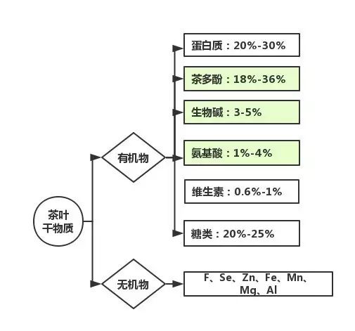 茶树的新鲜叶片当中,水分占75%-80%,,干物质中占22%-25%。茶叶中的化学成分,经过分离鉴定的已经有700多种了,种类真是非常的丰富。另外,加工过程中,反应形成更多的成分。我们喝茶之所以能喝到苦味、涩味、甜味、回甘各种细腻的层次,香气有花香、果香、豆香、嫩香、蜜香,就是因为茶叶中的物质实在是太丰富了。图中标绿色的三种成分:茶多酚、生物碱(主要是咖啡碱)、氨基酸(主要是茶氨酸),是茶中最重要的三种成分,也是关于茶研究最多的几种成分。 茶多酚、咖啡碱、茶氨酸,是茶叶的“特征性成分”,可以说是茶中三宝。为什么说它们是“特征性成分”?需要满足以下几个条件。●首先这些成分是茶中特有的,其它植物中很少或很少,而茶叶中含量高。茶多酚也叫茶单宁,是一类存在于茶树种的多酚类物质总和。咖啡碱虽然叫做咖啡碱,但是茶中的咖啡碱比咖啡中多。茶氨酸是一种茶叶特有的氨基酸,在其他植物中极为罕见。