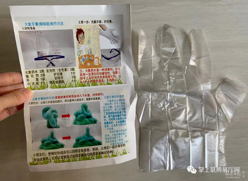 “大象牙膏”这一网红科学小实验的实验材料包是两个装有液体的小瓶被放置在一个写有“大象药水”字样的密封袋内,但到底是什么材料,却并未标明,和说明书上标出的实验橡胶手套不同,从实验套装中掏出的是一副薄薄的一次性塑料手套。