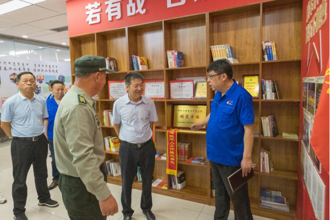 唐洪青司令员和各位领导认真观看了企业形象宣传片,参观了退役军人服务站并就民兵连建设、物资储备、每年服兵役等相关问题同负责人进行深入交流,详细了解了民兵连训练、参与地方建设、国防教育氛围营造等方面情况。