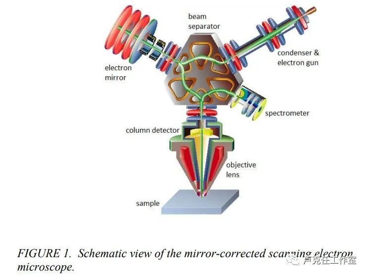 除了光学显微镜中的相位差分衬度成像,其实扫描电镜也有相近思路的技术。近年来,科研对获取高分辨率下的敏感样品原子尺度的横向信息成像和材料对比度的兴趣一直在升高。解决方案的一方面来自于降低入射电子能量有助于减少样品损伤,另一方面,电子束和样品的对撞交互量减小了,从而增加来自背散射电子信号的横向信息。然而,低压状态下的入射电子束能量,对电子光学来说却是增加电子的波长,于提升分辨率不利。所以,电子光学必须通过校正球面和轴向色差来完成这项任务。Zeiss在2013年前后曾提出一种叫mirror corrected镜面校正的扫描电镜电子光学方案,可以使用能量远低于1keV的电子束,而提供高分辨率分析,更可以对非常敏感的材料成像,还能具有高效的生产力。常识告诉我们,在这个级别的低能量成像中,传统方案的分辨率通常都会比较差,但这套独特的方法发现,通过electron mirror电子镜补偿物镜的初级像差,进行像差校正,则可以显著提高分辨率,特别是对于低能量的入射电子束。这套解决方案,也是利用了对电子束相位差分的补偿来改善成像的;这与光学的相衬显微术,和这篇中讲的集成式差分相位反差iDPC,是殊途同归的。