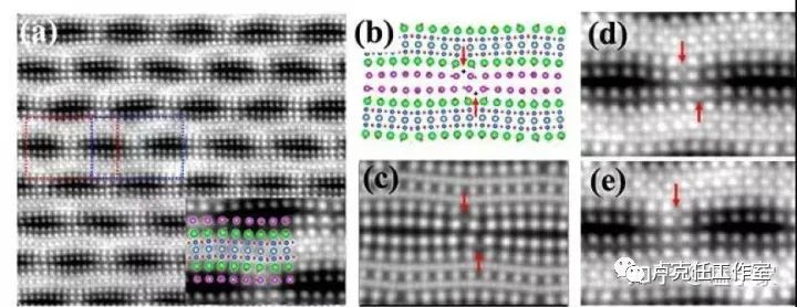 超导Bi-2212中掺杂氧原子的iDPC像 (a)Bi-2212[010]带轴的iDPC像 (b, c)Bi2212的原子结构模型和基于原子模型的像模拟 (d, e)掺杂氧原子在不同位置的不均匀分布。