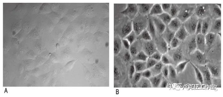 A:普通明场显微镜效果 B:相衬显微镜效果