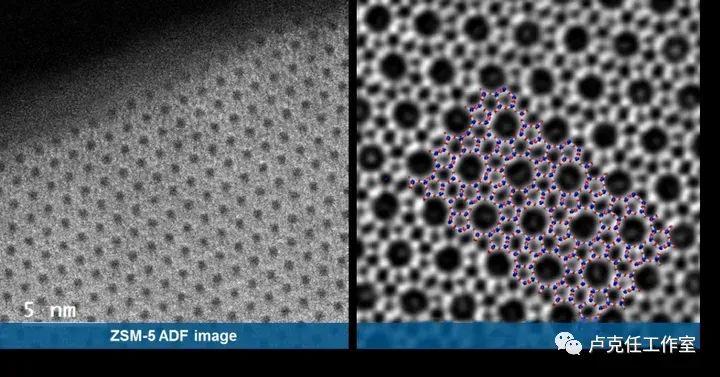 吸附了 VOC 的 Silicalite-1分子筛:(左) HAADF 图像;(右)iDPC 图像。