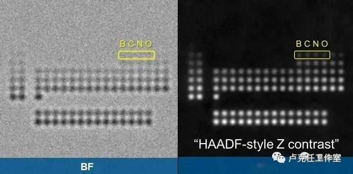 铁电铁磁陶瓷和高温超导体的性能与其内部轻元素原子的空位和缺陷有关,因此能否借助透射电镜直接观察到轻原子是材料研究中的关键一环。现有的STEM技术,虽然利用HAADF探头获得的原子序数衬度像可用于区分重原子,但是对于C,N,O等轻原子却杯水车薪,因为在大部分情况下会由于信号过低而无法“看到”这些轻元素的原子。虽然使用STEM中的ABF像可以“看到”这些轻原子,但是又带来了ABF图像无法直接解读,需要通过模拟计算确认,以及对样品厚度要求高,图像信噪比不佳等问题。