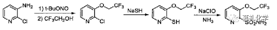 2、德国诺华专利WO0005212报道了新的合成路线,同样以2-氯-3-氨基吡啶为起始原料,先与亚硝酸叔丁酯进行Heck-Matsuda反应得到吡啶三氟乙基醚,再和硫氢化钠发生取代反应得到吡啶硫醇,然后氯磺化氨化得到吡啶中间体。虽然该路线仅需三步反应,但是第一步的收率仅有30%左右,而且该步反应需要金属催化剂参与,操作要求非常高。