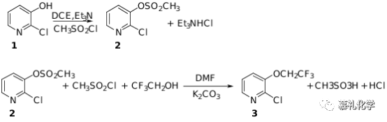 我们同样以2-氯-3-羟基吡啶为起始原料,通过与甲磺酰氯的反应,得到甲磺酰吡啶酯,然后再与三氟乙醇进行反应,得到吡啶三氟乙氧基醚。该步骤较为简单,收率也较高。简单投料比例如下: