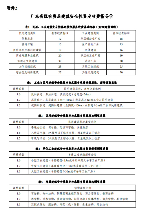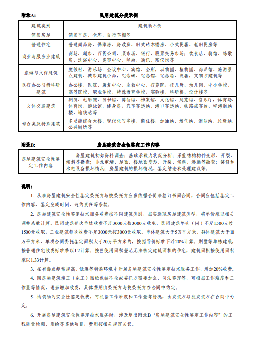 房屋鉴定分为两种,一种是完损性鉴定,一种是可靠性鉴定。2、调查房屋的历史沿革。包括:使用情况、检查检测、维修、加固、改造、用途变更、使用条件改变以及灾害损坏和修复等情况;3、检查核对房屋实体与图纸(文字)资料记载的一致性;6、采用文字、图纸、照片或录像等方法,记录房屋结构构件(墙体、楼屋面等)、装饰装修、设备、非结构构件和建筑附属物(室外地坪、排水沟、台阶)的损坏部位、范围和程度;7、分析房屋损坏原因;8、综合评定房屋完损状况,并出具《房屋完损鉴定报告》。3、检查砖墙砌体的损坏情况:破损、裂缝、倾斜、弓凸、风化、腐蚀、高低不平、灰缝酥松等;5、调查主题结构的原始材料及使用历史,对结构老化程度、功能变化、传力路线及连接构造等进行记录、分析;6、对房屋主体结构形式、结构的布置进行检查、复核;8、对房屋的轴间距、层高、构件截面尺寸等结构尺寸进行测量复核;9、对房屋先有损伤、裂缝分布与大小进行调查和记录;10、对房屋主体承重结构的垂直度和整体变形进行测量;11、对钢筋混凝土构件的梁、柱、板混凝土强度和钢筋配置进行抽样检测;12、根据现场查勘及检测的情况,依据现行国家有关规范对该房屋上部结构实际承载能力进行复核;13、综合检查、检测情况及验算结构,对房屋现时的安全性等级进行评定,并出具《房屋安全鉴定报告》,并针对出现损坏的构件、不满足的构件提出合理的处理建议。价格依据是《广东省既有房屋建筑安全性鉴定收费指导价》,详见下表: