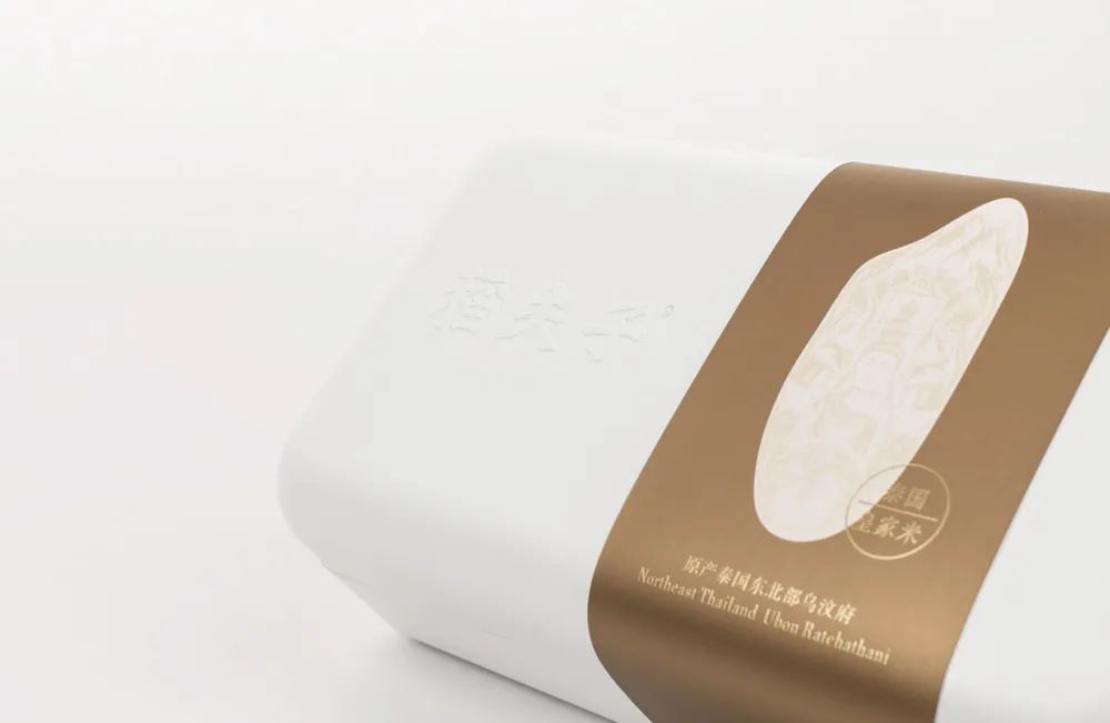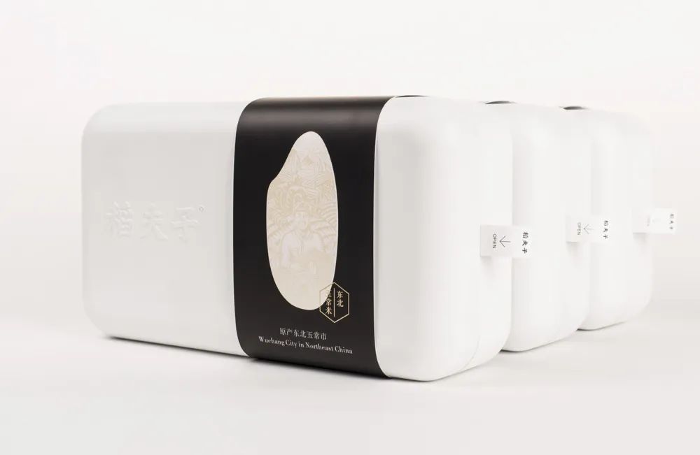 大米粒形象配合田园背景作为视觉元素以浮雕形式压制在盒子上,波浪线条既表现田园丘陵地形又表现出风吹稻香的灵动,圆润饱满的大米粒和穗长粒多的水稻造型也表现出了大自然的丰饶和产品的优质美味,设计简洁而不失细节。
